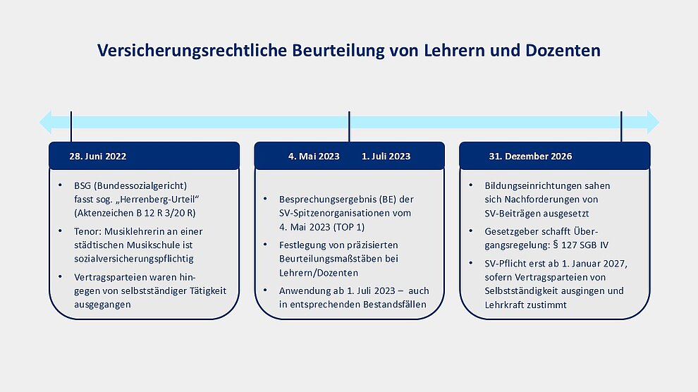 Nach der Übergangsregelung in § 127 SGB IV soll eine Feststellung des Sozialversicherungsstatus von Lehrkräften als abhängig beschäftigt durch die Sozialversicherungsträger bis zum 31. Dezember 2026 ohne Wirkung bleiben; d. h. die Versicherungspflicht soll erst ab dem 1. Januar 2027 beginnen. Dies gilt immer dann, wenn