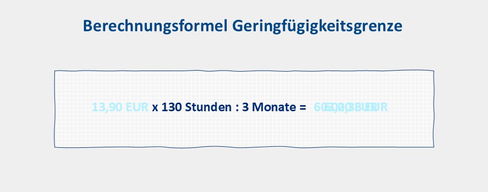 Berechnung: Als dynamische Obergrenze für einen Minijob orientiert sich die Geringfügigkeitsgrenze an einer Wochenarbeitszeit von 10 Stunden zum gesetzlichen Mindestlohn. Der gesetzliche Mindest-Stundenlohn wird mit 130 Stunden (13 Wochen pro Quartal multipliziert mit 10 Stunden) vervielfacht, durch 3 Monate geteilt und der sich daraus ergebende Betrag wird auf volle Euro aufgerundet. Eine wöchentliche Arbeitszeit von 10 Stunden entspricht einer Arbeitszeit von 43 Stunden und 20 Minuten im Monat.