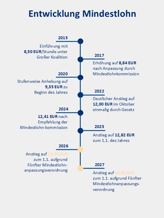 Die Mindestlohnkommission hat alle zwei Jahre über eine Anpassung der Höhe des gesetzlichen Mindestlohns zu beschließen (§ 9 Abs. 1 MiLoG) – heißt also bis zum 30. Juni 2025 für die Jahre 2026 und 2027. Am 27. Juni 2025 erfolgte der fünfte Beschluss mit einer Erhöhung in zwei Stufen (jeweils brutto je Zeitstunde):